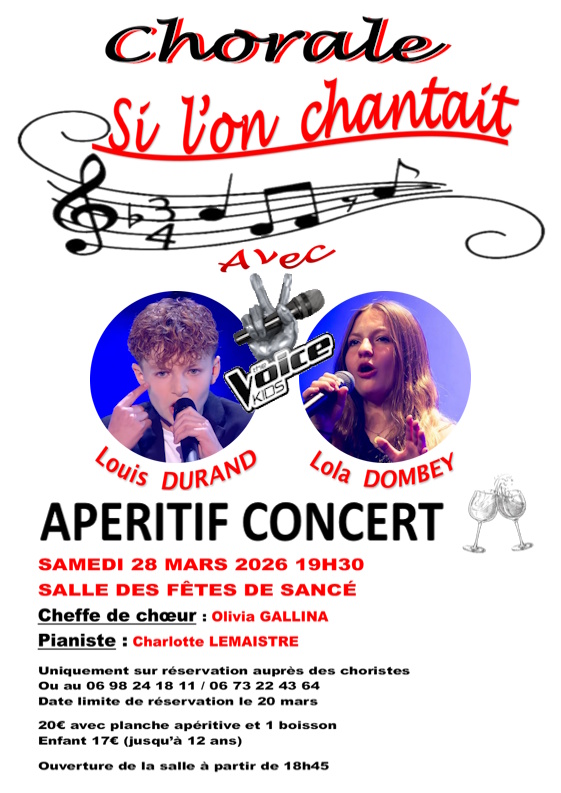 - un APERITIF CONCERT le samedi 28 mars 2026, uniquement sur réservation – ouverture de la salle à 18h45. Un programme riche et varié autour d’une planche apéritive et d’une boisson